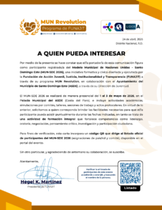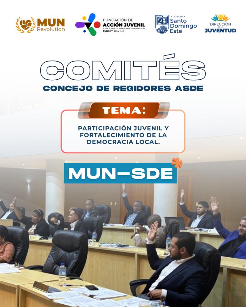MUN-SDE | 1er MUN de RD a nivel municipal de RD. Una experiencia formativa de debate, negociación y liderazgo juvenil, diseñada y ejecutada por FUNAJIT a través de MUN Revolution, en colaboración con el Ayuntamiento de Santo Domingo Este (ASDE).